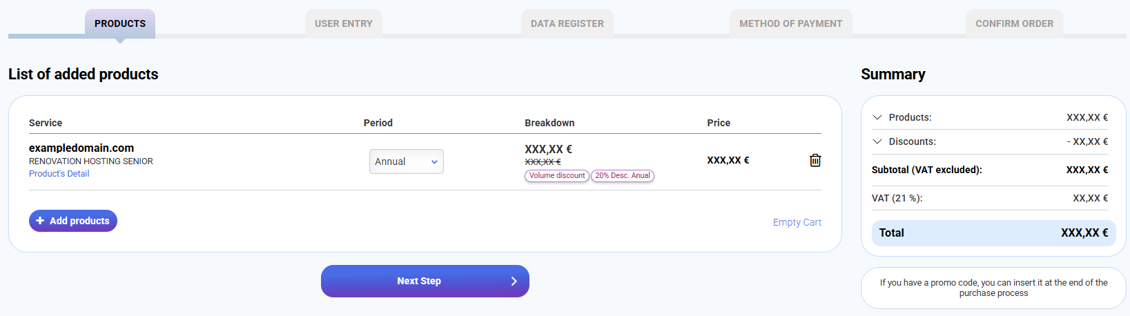4.- In the shopping cart, you can see a list of the added products, where you will find your hosting. By default, the annual period is selected, but it can be changed to quarterly or semi-annual depending on your needs. Once you have reviewed the renewal details and chosen the period (annual, quarterly or semi-annual), click on Next stepand continue with the payment process.