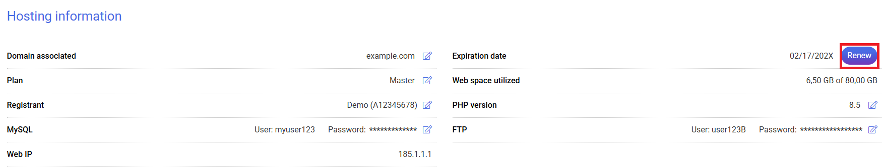 2.- On the hosting management screen, you can see the "Hosting information" section, where you will find basic information about your hosting such as the domain name, plan type, owner, etc. In this section, click on the Renew option in the "Expiration" area.
