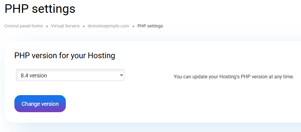 Advanced hosting tools is the Configure PHP option, where you can modify different PHP policies to adjust your hosting to the requirements requested in some CMS applications. These values have a different scale depending on the plan you have contracted.