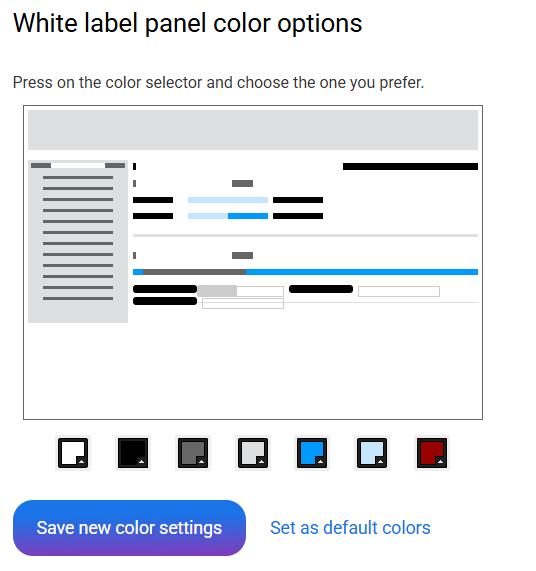 From this section you can modify the colors you want to present on the white label panel. Just tap on each set color, in the boxes below, and click onSave new color settingsto assign the chosen color.