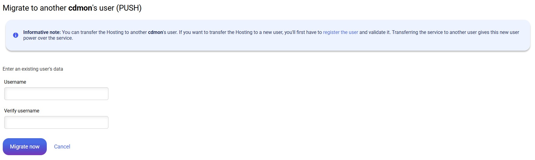 You will be taken to a screen where you must enter the username of the user to whom you want to transfer the hosting. You need to enter the name twice, once in the 'Username' field and again in the 'Verify username' field, then click on Migrate now.