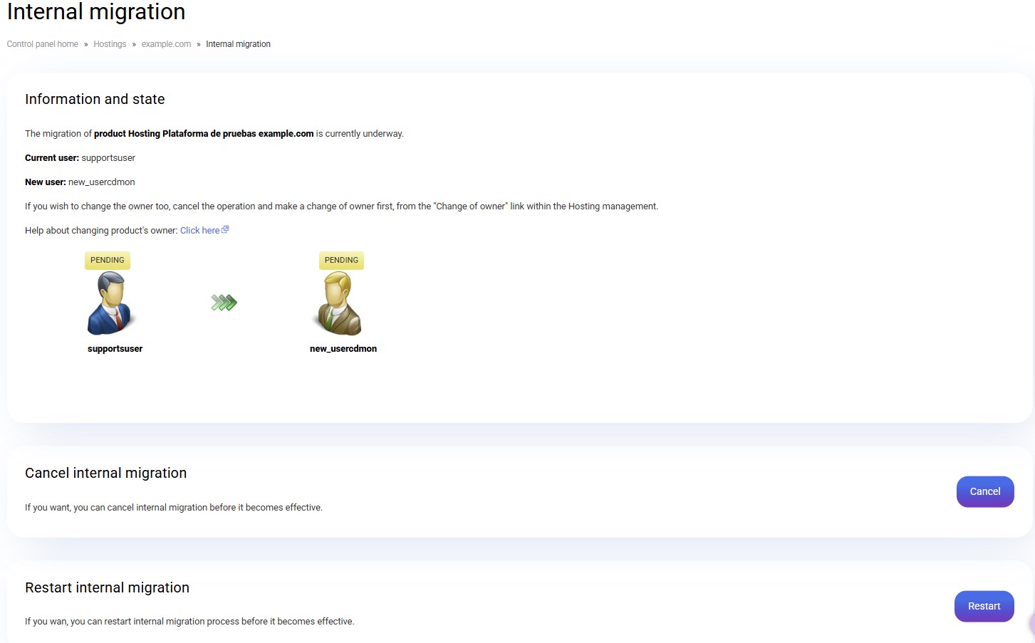 Dear customer,We inform you that an internal migration has been requested for the following product:Hosting Testing Platform exampledomain.comTo make the migration effective, you must confirm your agreement as the current user of the product at the following link:Once both users have given their consent, the migration will be completed and users will be notified by email.If both parties do not confirm the operation within a maximum period of 60 days, the internal migration request will not be completed and will be discarded.For any inquiries, we are at your disposal through cdmon support or by phone at 93 826 49 11 - 91 182 27 67.Kind regards,The cdmon teamIf you access Internal migration again from the control panel, you can see the current status of the migration. You also have the option to cancel or restart the migration in case one of the users has not received the acceptance email.