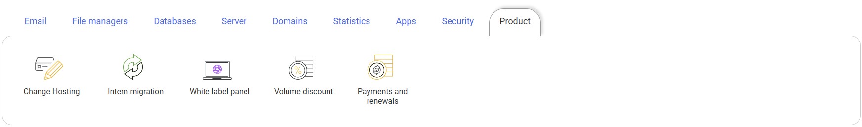 In the Internal migration option that appears in the 'Product' section of the hosting management panel, you can perform different operations to transfer hosting.