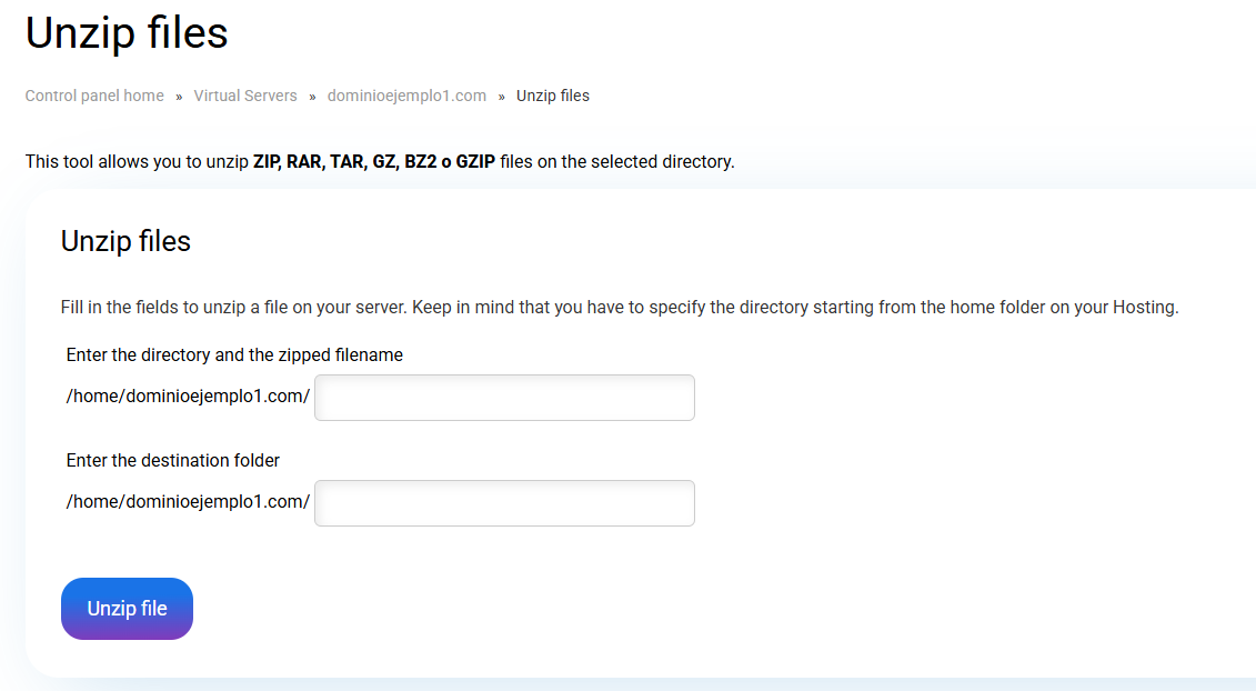 To use this tool, you must upload the file via FTP that you want to extract. Then, within the tool, you must specify the path where the file is located and the destination path where you want to extract it. Once the details are specified, click on "Extract file" to start the process. Supported compression formats are ZIP, RAR, GZIP, and TGZ. Once the process is completed, you will receive an email confirming that the extraction has finished.