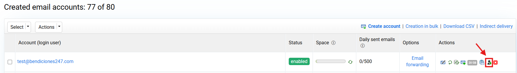 - In the list of email accounts, you’ll see all the existing accounts. Find the account you want to configure and click the download button for the auto-configurator.