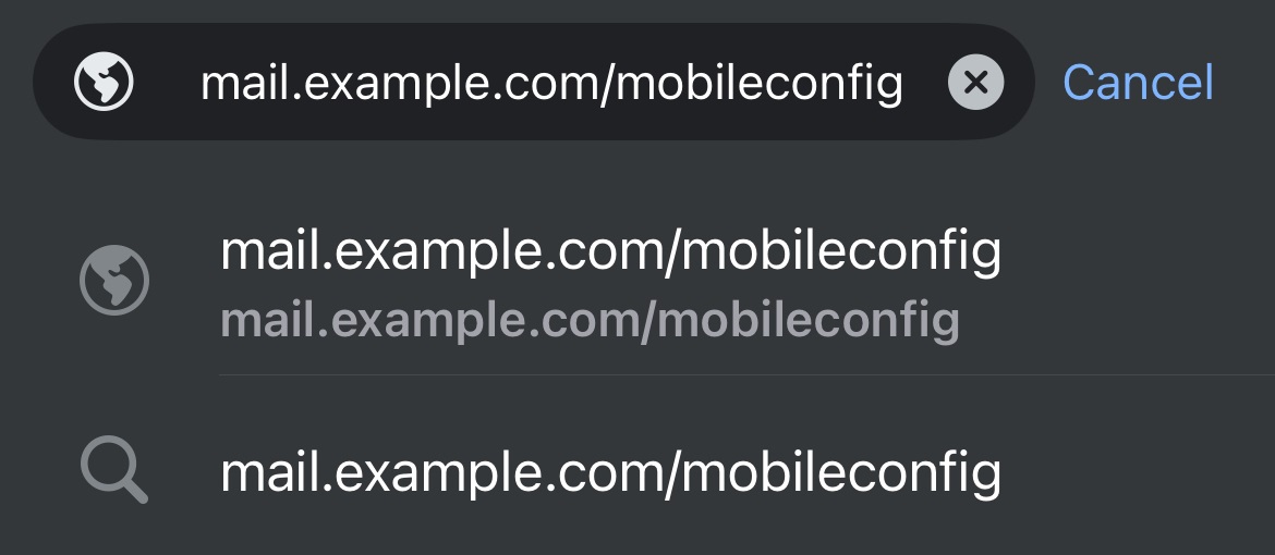 - Use the mobileconfig link, open Safari or another browser and go to: https://mail.yourdomain.com/mobileconfig