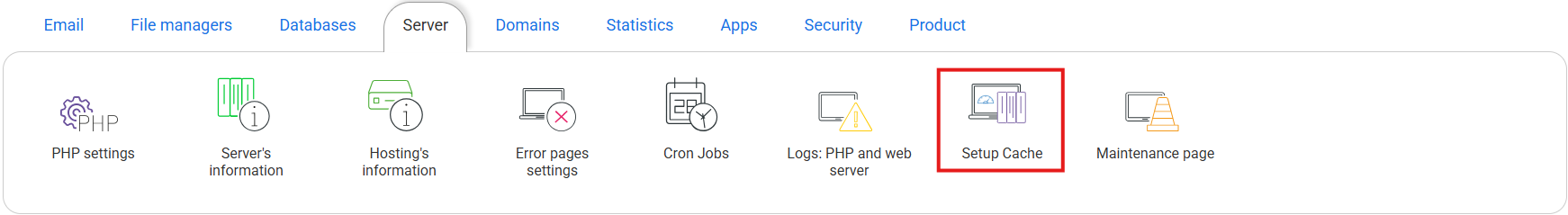 To go to the Cache section, you must access the Hosting management which wants to modify and go to the Server section, to the logo of "Manage Cache":