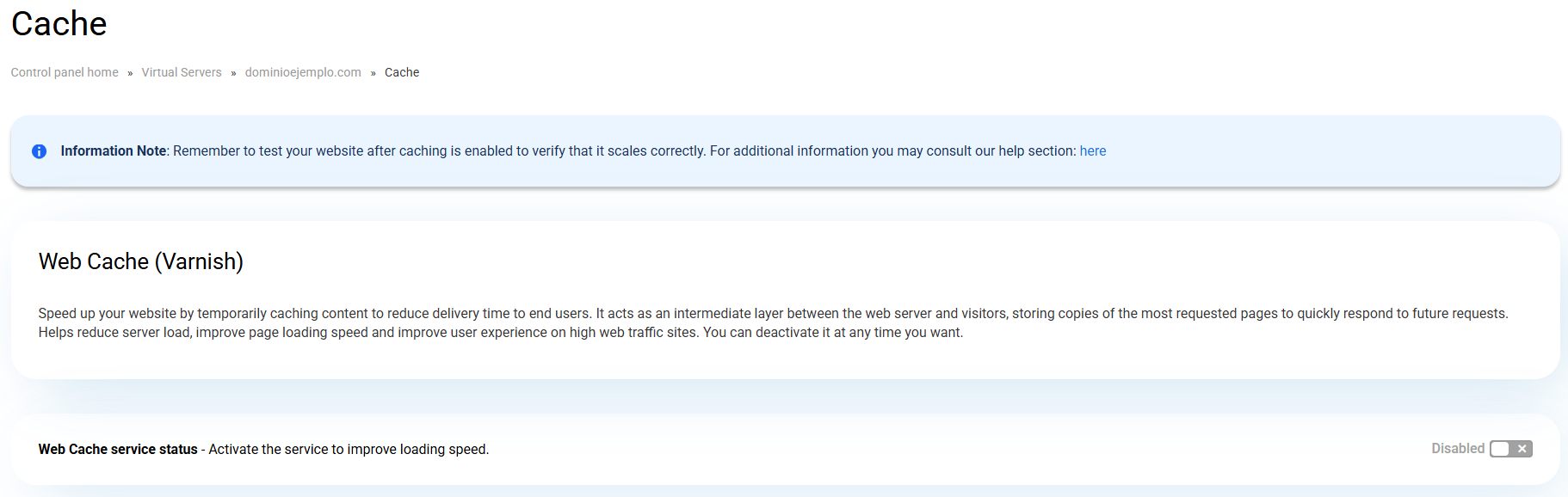 Once inside, you will already be in the window to manage the hosting cache. The first thing you need to do is trigger the cache in hosting, as it is disabled by default:
