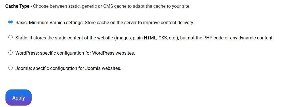 If you have multi-domain hosting, it is important to carefully consider what kind of cache to activate. In situations where you have multiple sites in different folders, the basic cache is the safest choice. Using the specific WordPress or Joomla cache in a domain can lead to conflicts and errors with other domains in the same hosting.