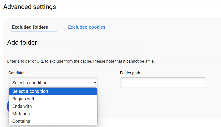 - "It's equal to":Use this option if you want to exclude a specific folder by its exact name. For example, if there is a folder called a "test" that you do not want to cached, choose this condition and enter the exact name of the folder.