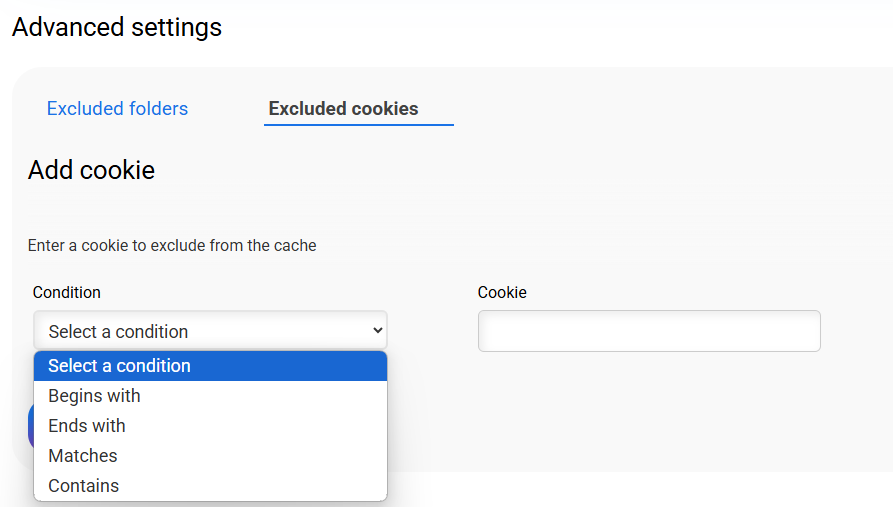 In this section, you can add the cookies you wish to exclude from the cache tool to work without it. Click on "Add cookie":