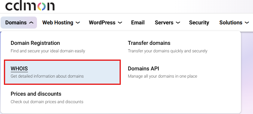 To perform a WHOIS search, you must access our main page cdmon.com, go to the "Domains" section and click on "WHOIS Search".
