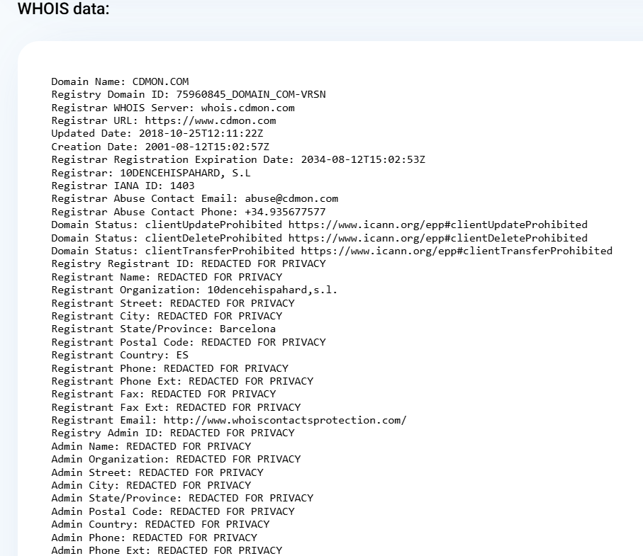 When a domain is registered, the data becomes part of a public database: the WHOIS. Depending on the domain extension, this database is managed either by the registrar itself or by the registry entity. cdmon is an ICANN-accredited company, which is why you can check the public information of any domain.