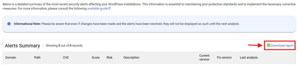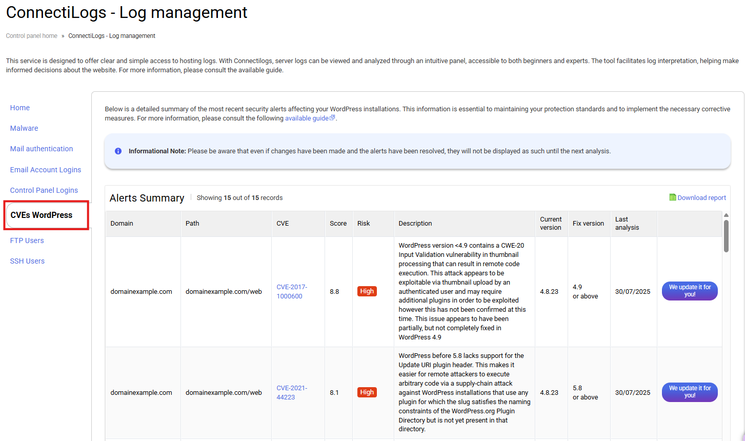 From our control panel, you can directly access the "Security Alerts" section to monitor detected vulnerabilities in your hostings. This section provides you with a detailed overview of the most recent vulnerabilities affecting your WordPress websites.