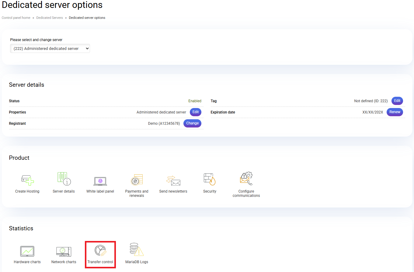 In order to be able to manage the transfer of your Managed Dedicated server, such as the hosting you have created on the server, you must access the management of the Dedicate from your dashboard cdmon and click on the option Transfer control.