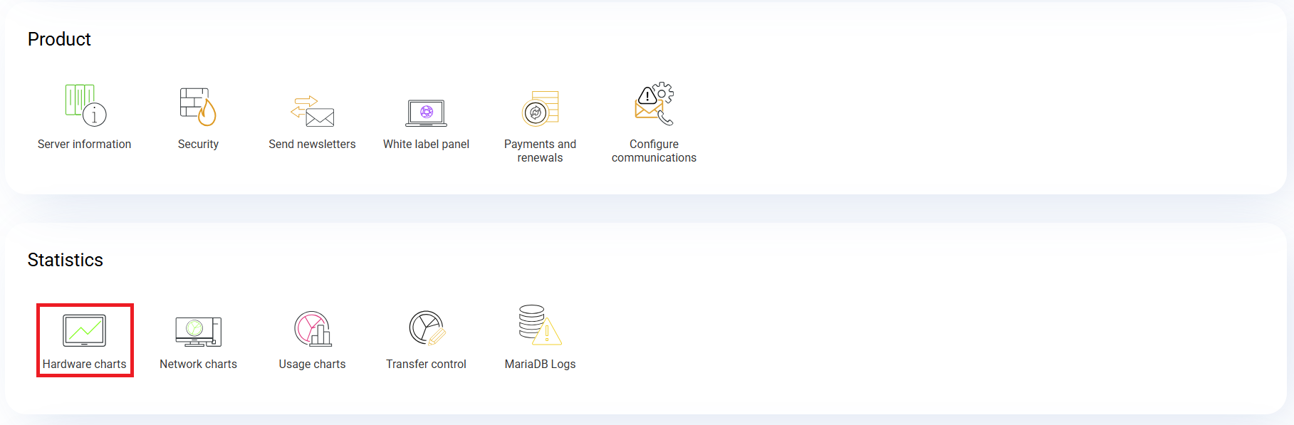 The hardware graphs allow you to visualize the status of your server. To access them, go to your server management from the control panel of cdmon and click on the option Usage graphs. In the "Hardware graphs" section, you can view the following ...