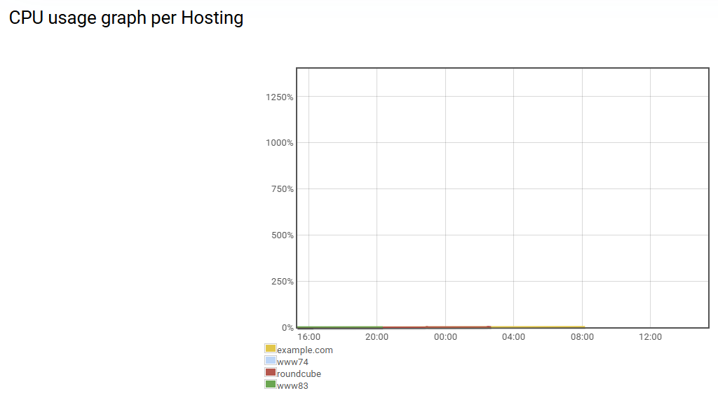 This graph shows a list of the ten hostings that consume the most CPU. The horizontal axis shows the CPU usage of each hosting by time slot, while the vertical axis shows CPU usage in %. In this example, the server has 4 CPU cores, equivalent to 400 on the vertical axis.
