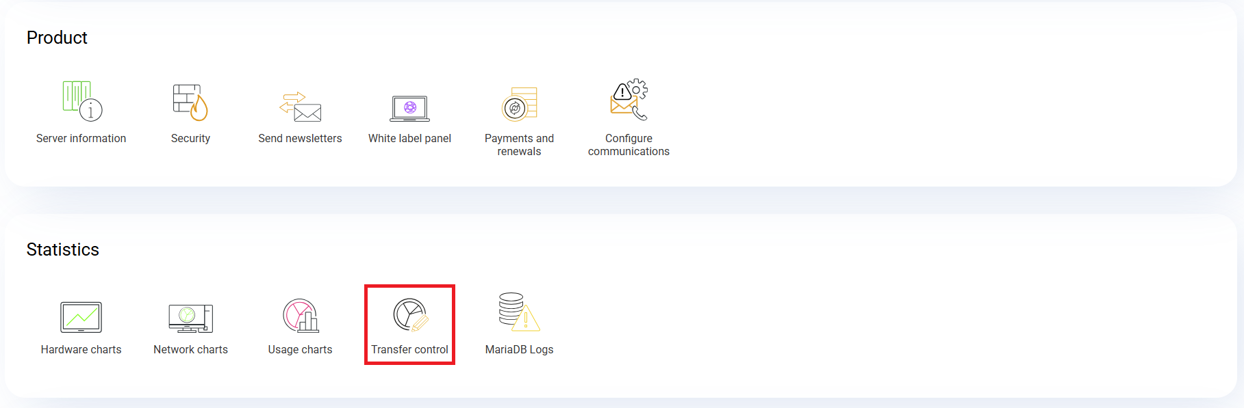 To monitor and manage the transfer of your Virtual Up server, as well as the hosting accounts you have created on it, you must access the Virtual management section from your cdmon control panel and click on the Transfer control option.
