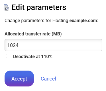icon, you can edit the assigned transfer and the option to disable the hosting if it exceeds 110% of the transfer.