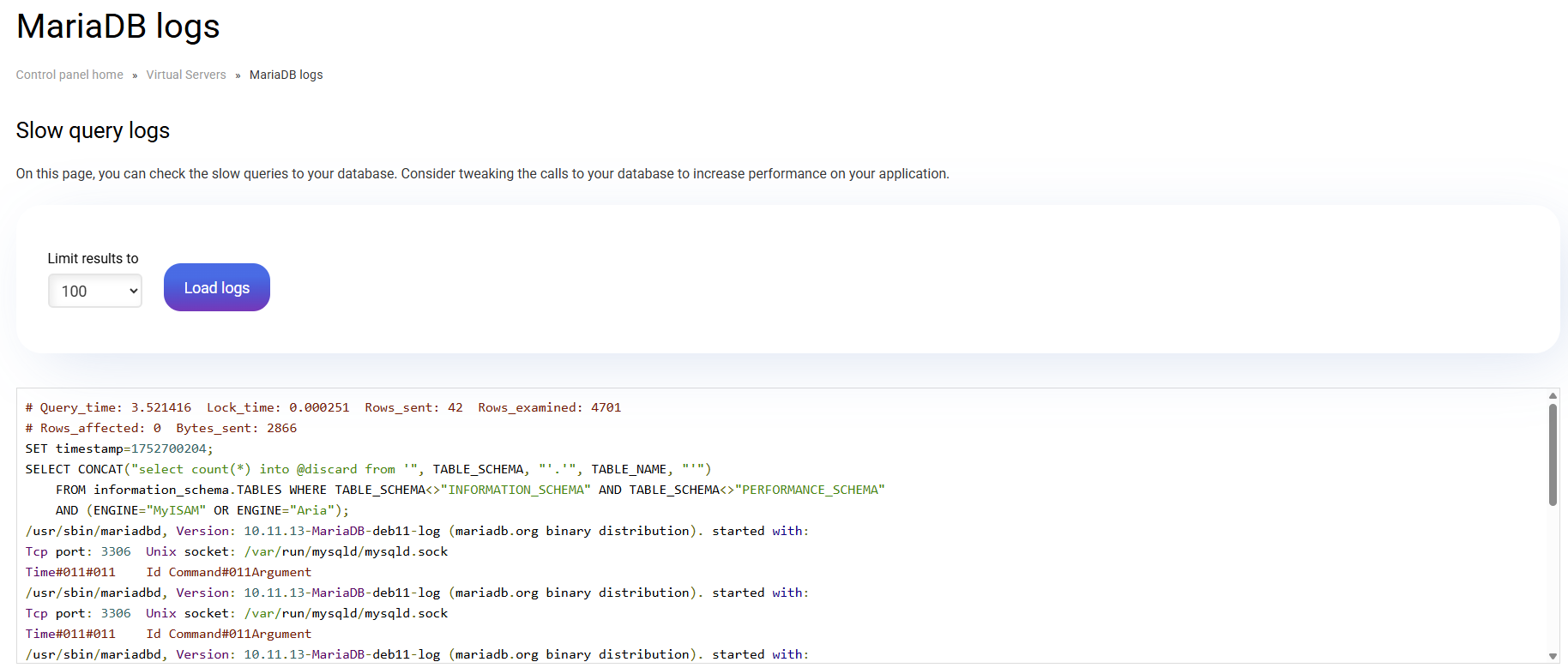That section is already MariaDB's new log screen. On this page you can review the slow queries in your database and fine-tune that database to increase its performance.