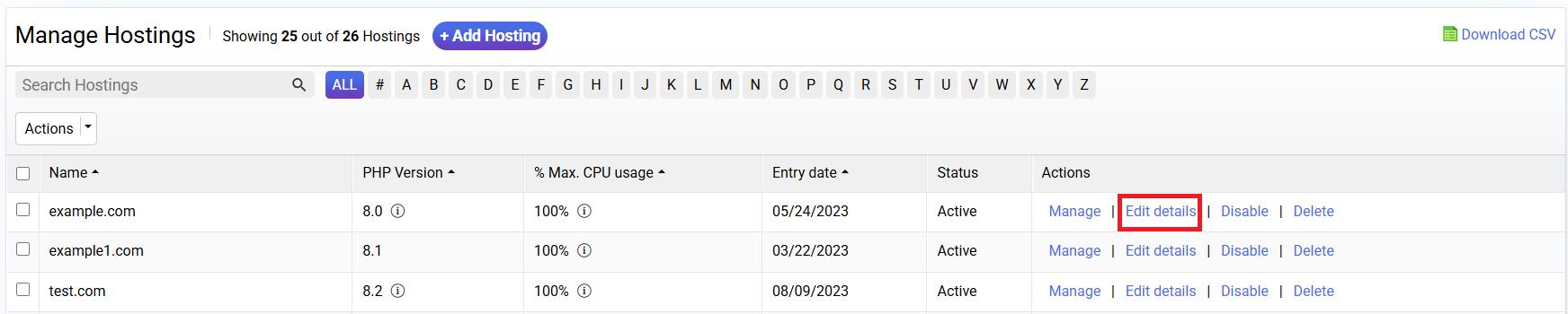 Once on the "Manage Virtual Server" screen, click on the Edit details option. This will take you to a form where you can modify the web hosting by distributing the available resources.