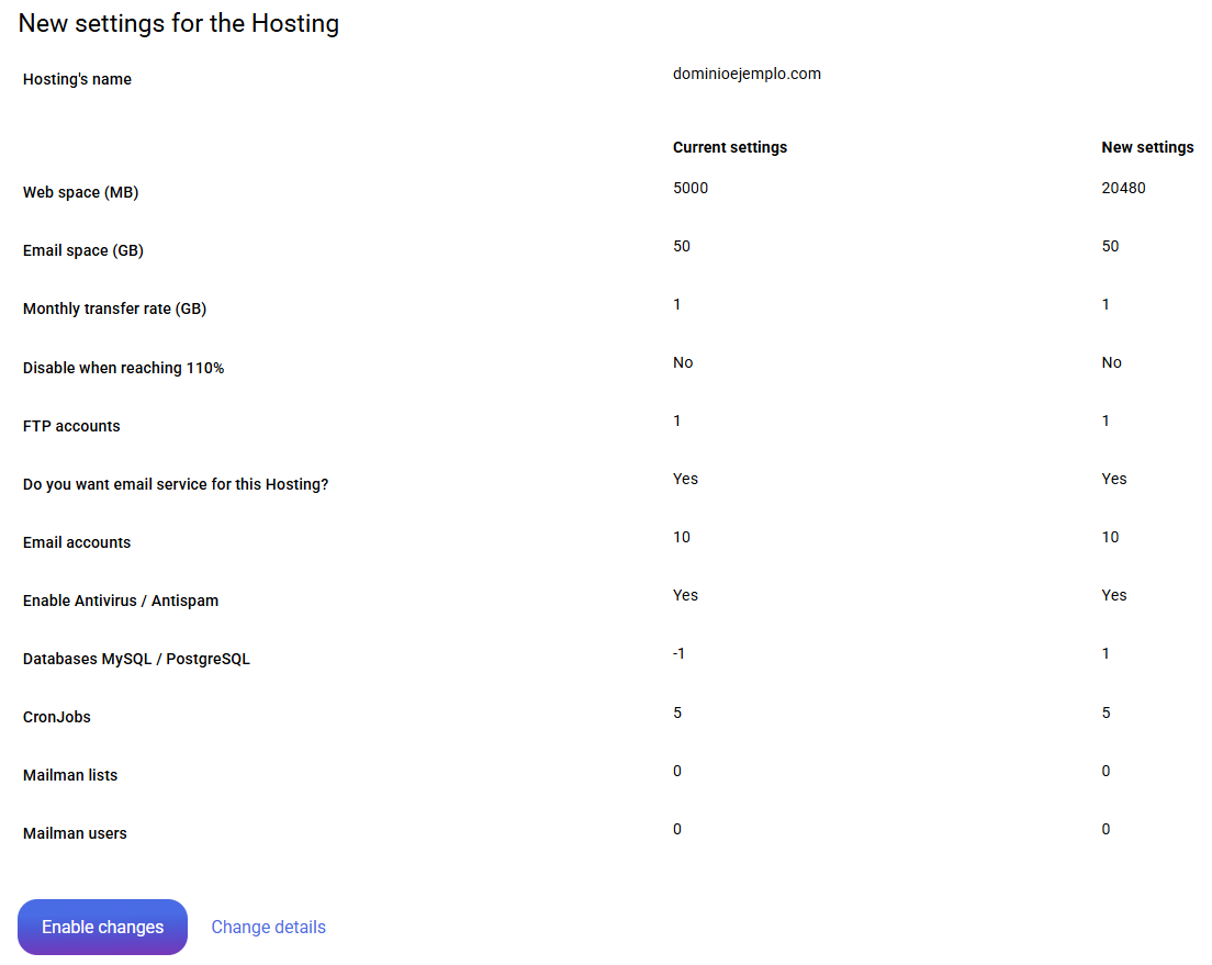 If you want to apply these new features, simply click again on Enable changes and they will be implemented in the hosting.
