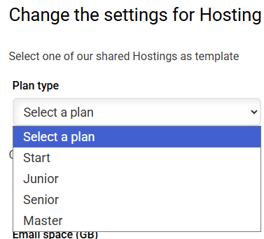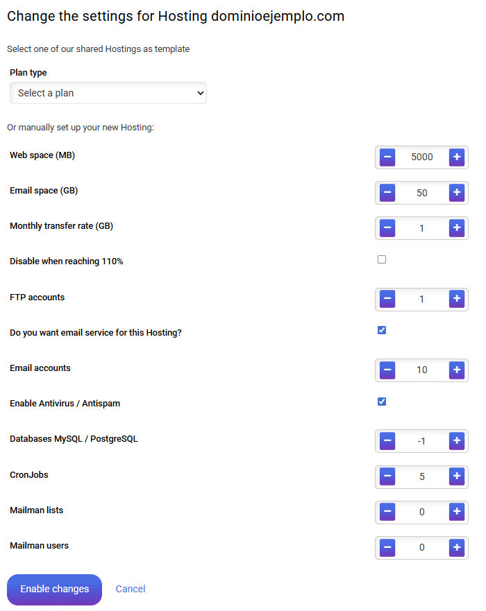 Modify features - Once here, a form will appear allowing you to edit the features of the selected hosting: