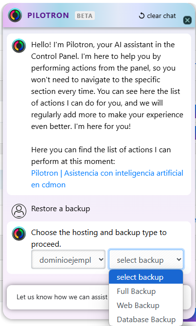In chat, write a text like "Restore a backup". Pilotron will show you the available options and guide you in selecting the type of restoration you need: