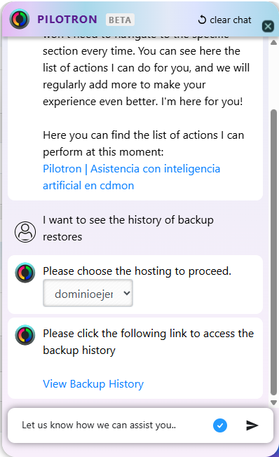 In the chat, write "I want to see my backup restorations". Pilotron will attach a link to access the "Historic of restorations made", indicating the date and type of copy restored.