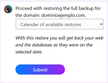 Complete restoration:The complete restoration retrieves all databases and files in the hosting, and replaces the current content.