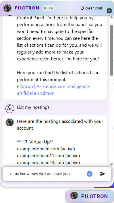Pilotron is your artificial intelligence assistant in the cdmon control panel. With this tool, you can manage and obtain information about your hostings quickly and easily, without having to manually navigate through the control panel.