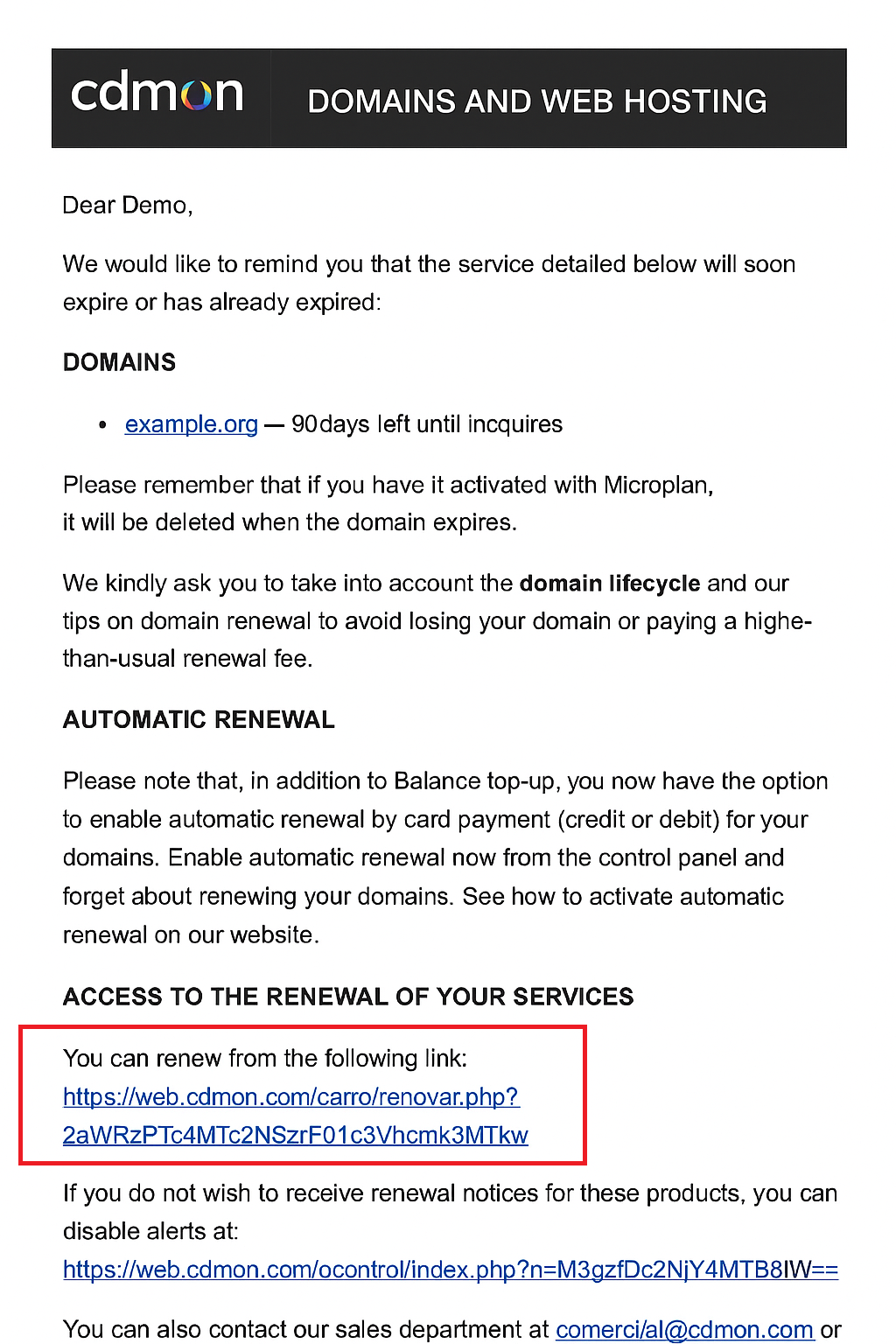 You can renew the domain by using expiration warning emails sent to the user account of cdmon. To do this, you need to follow two simple steps: