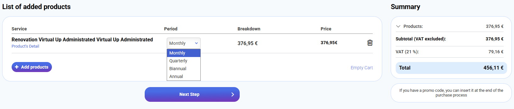 By default, the period “Monthly” will be selected, but you can change it to “Quarterly” or “Semiannual” according to your needs. Once you have reviewed the renewal details, click Next step.
