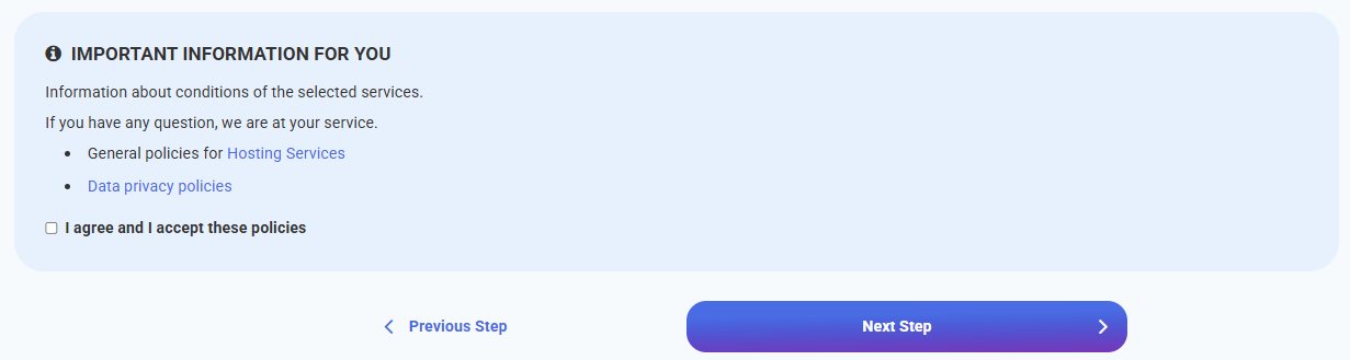 In the next step, you will see a summary of the order: a list of products to be renewed, billing details, payment method, and the terms and conditions that you must read and accept. Click Next step to complete the order.