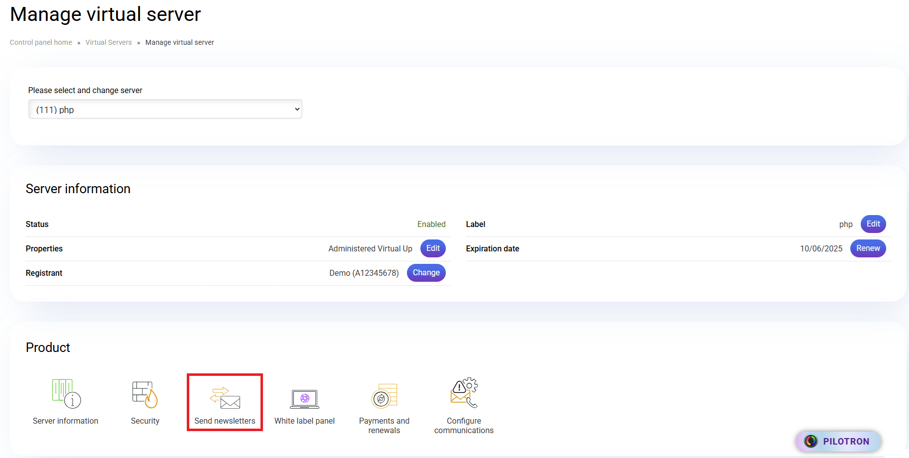 From the Virtual Up server control panel, you can conveniently manage your server. The panel is composed of an administrative section, a server control and management section, and a hosting management section. Administrative management From the ...