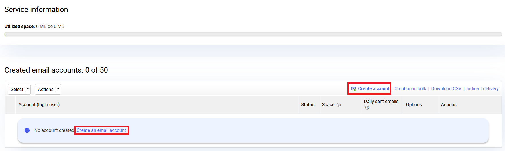 - Account storage space. By default, the maximum available is shown: 5120 MB. If you need more space, you can upgrade it to Premium once it is active.