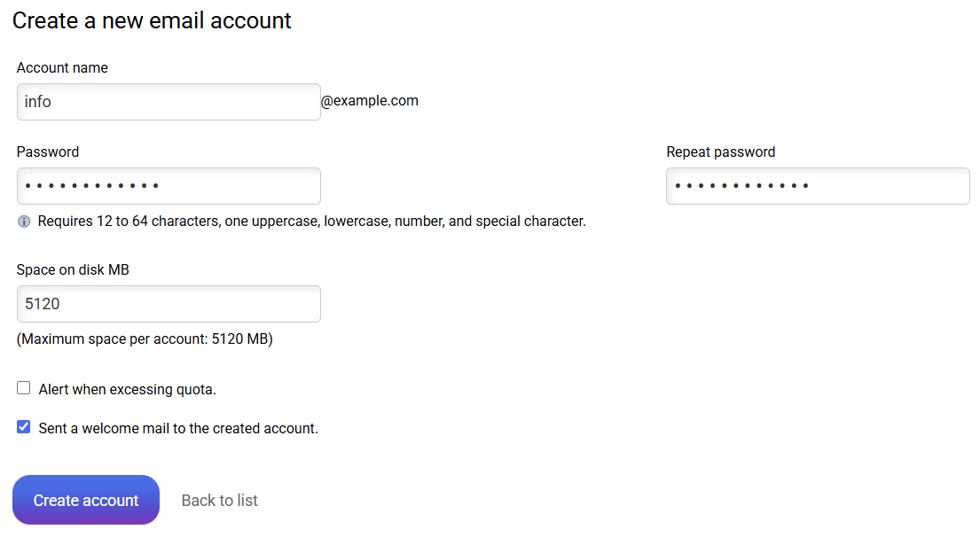 - First, you must enter a name for the account in the Account name field. The most commonly used are info@, admin@, contact@, ...