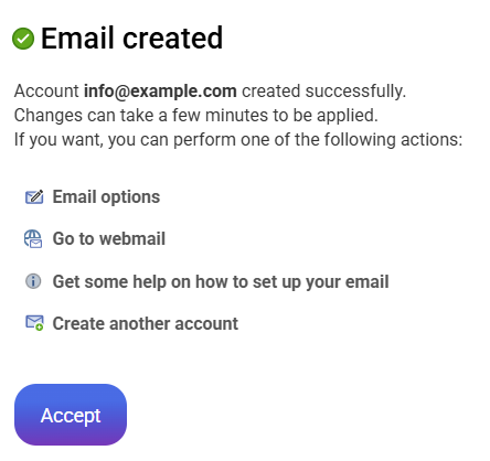 If the system has been able to create the email account, a pop-up will open confirming that the email account has been created successfully and showing a series of actions we can perform:
