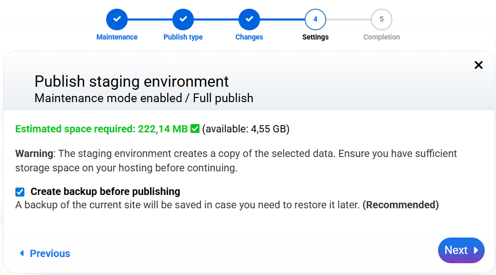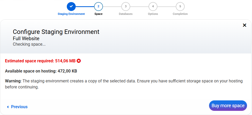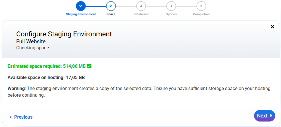 The system will automatically calculate the estimated space needed for staging and compare it to the available hosting space: