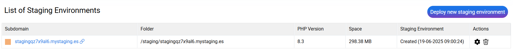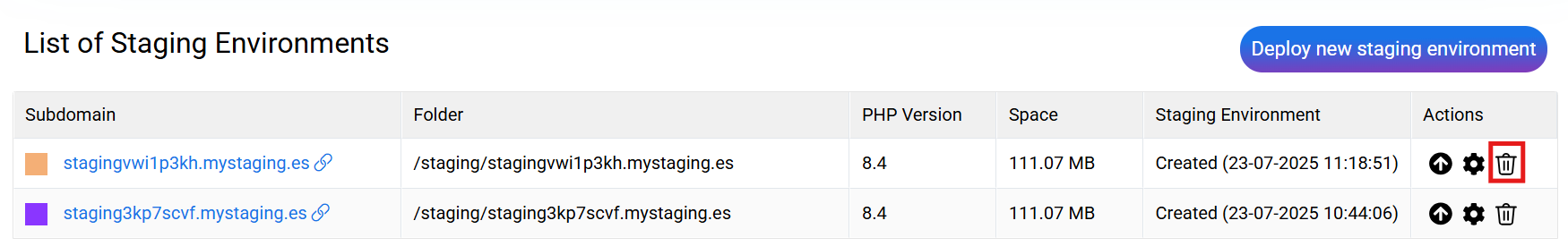 If you want to delete a test environment, click Delete () to erase staging and free up space in your hosting.