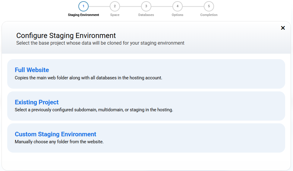 Existing project: clone an already created staging, a subdomain or multidomain of hosting.