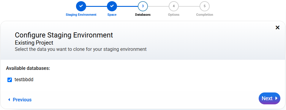 The staging will duplicate the selected database, adding a random prefix to the original name to avoid conflicts.