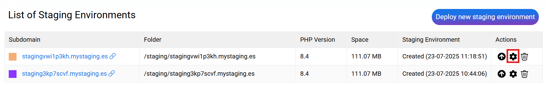 Once the environment ofStaging, this will be housed in a random subdomain with active SSL such as: stagingowts82cm.mystaging.es