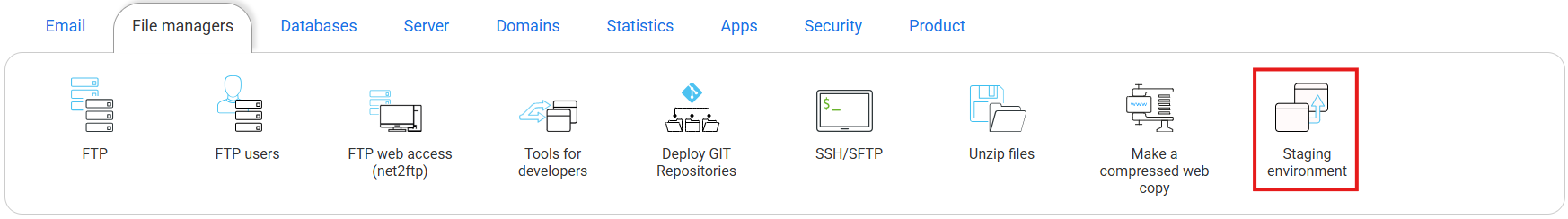 Inside the hosting panel, go to the section File managers and click on Staging.