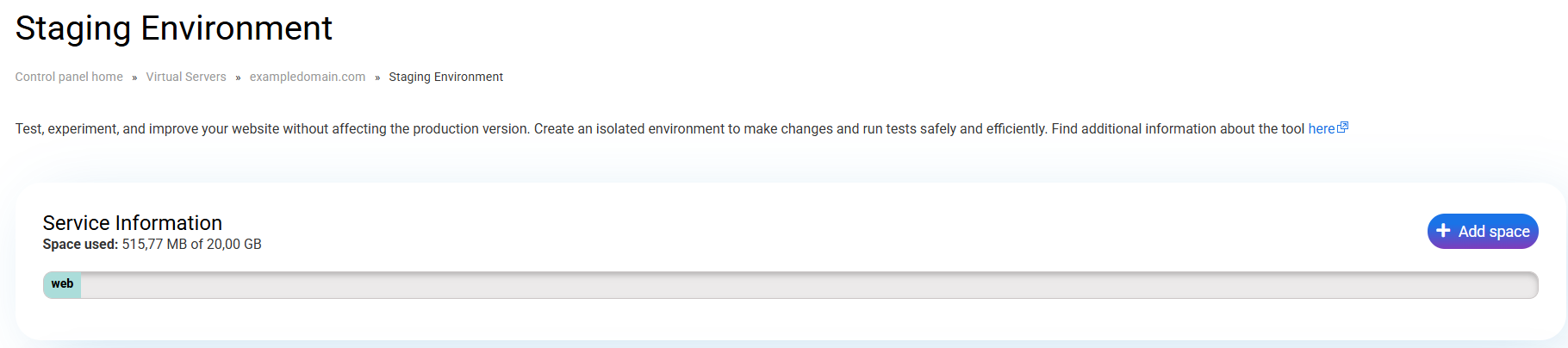 If space is missing, it will be displayed in redand you can add more from the "Contract More Space" button or you will need to free up hosting space in order to create the Staging.