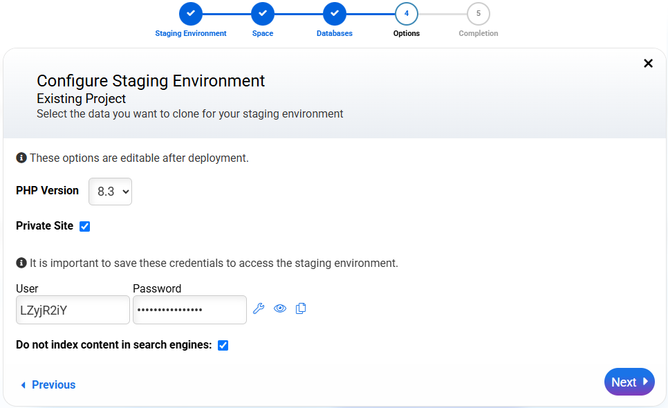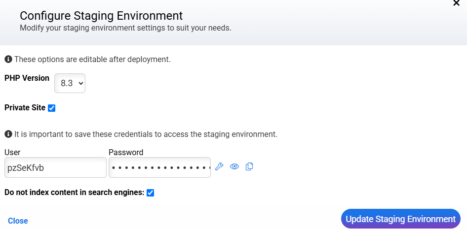 Do not index content in search engines (default marked option): Prevents Google or other engines from indexing environment content and generating duplicate content.