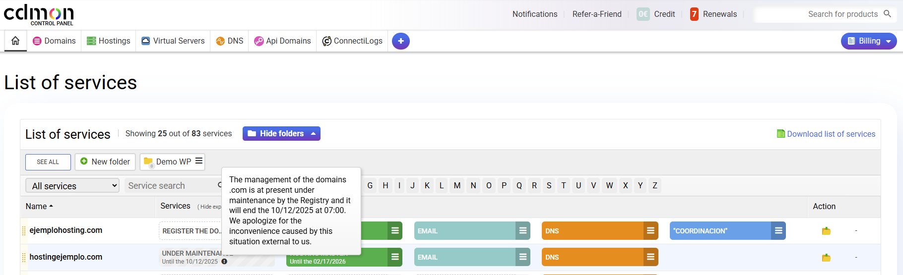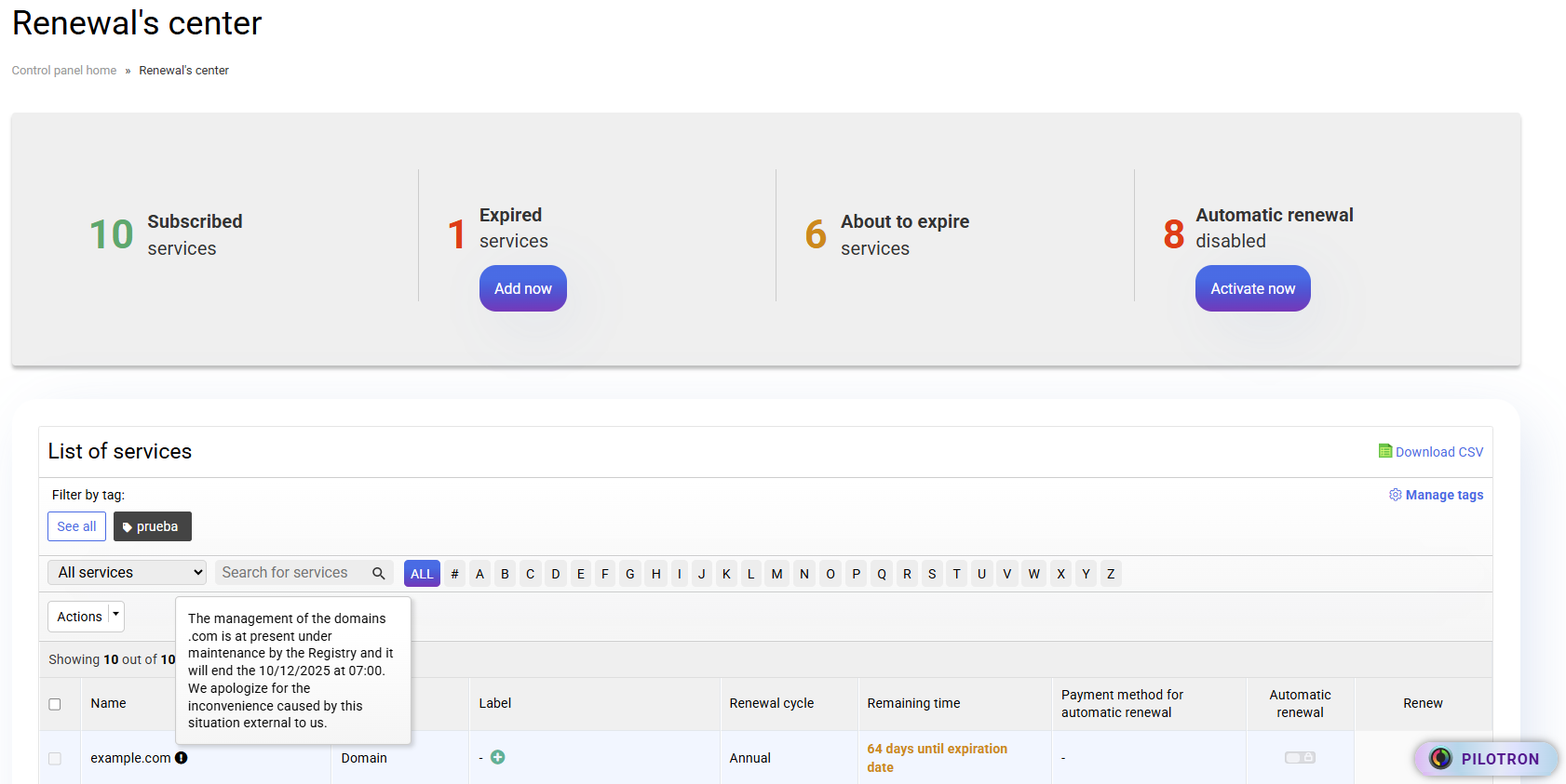 In this case, the only action that cannot be taken is Renew a domain that is under maintenance, but to avoid in consistencies with other possible actions, we have blocked the possibility of taking any related action with the Renewal and automatic renewal, we have also added a notice to report the status of the domain: