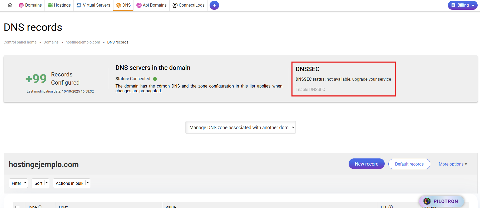 On this screen we have blocked the enable/disable DNSSEC button which is the only action that comes in In conflict with the maintenance of a domain, the rest of the actions are still available during this process, you can create, edit and delete records without any problems: