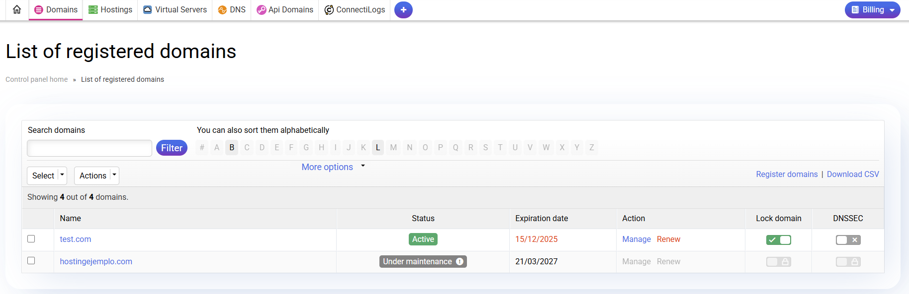 To access the "List of Registered Domains", you can do it from the "Basic list of services" by clicking on the Domain List option. From the "List of registered domains" you can manage your domains clearly and effectively. Filter domains by search: ...