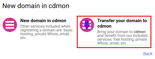 In the domains option you will see two possibilities: “New domain” or “Transfer your domain”. Click on the option Transfer your domain to cdmon.